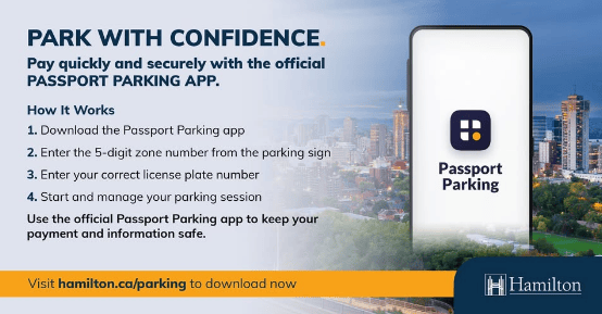 It’s now easier for you to pay for parking in Hamilton using the Passport Parking App on your smartphone. No more searching for change and running to the meter before it runs out. Simply download the new Passport Parking App from the Apple Store or Google Play Store to create your free account. Park anywhere you see the Passport Parking App sign, enter the location ID number to pay, track or add time to your parking directly from your smartphone. The App accepts Visa and Mastercard payments only. More info here.