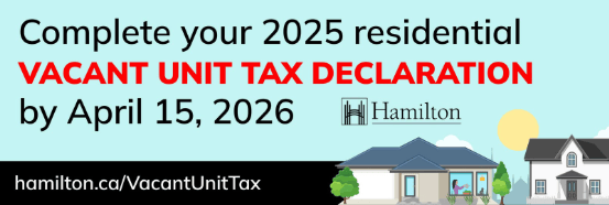 The Vacant Unit Tax applies to all properties classified as residential under MPAC, including single-family detached, townhouses, row houses, and multi-family dwellings (duplexes to sixplexes). In Hamilton, this represents approximately 180,000 properties. The VUT aims to increase the supply of housing in Hamilton by encouraging homeowners to keep their properties occupied rather than vacant, and supports the City’s broader housing strategy.