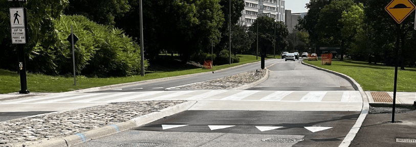 Raised crosswalks with warning signs and pavement markings at Morwick Drive